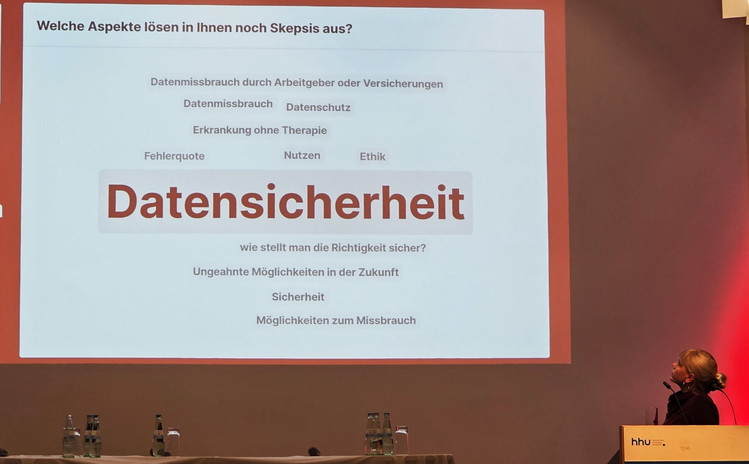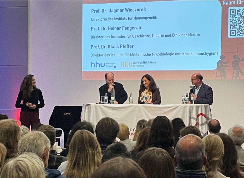 Im Anschluss an den Vortrag wurde der Abend durch eine Ethik-Podiumsdiskussion abgerundet – mit unserem Expert*innenteam der HHU und des UKD: Prof. Dr. Dagmar Wieczorek, Prof. Dr. Heiner Fangerau und Prof. Dr. Klaus Pfeffer. Das Publikum stellte zahlreiche Fragen – etwa zur „Personalisierten Medizin“, zur Datensicherheit, zur Rolle von Künstlicher Intelligenz und zur Überwachung zukünftiger Pandemien.