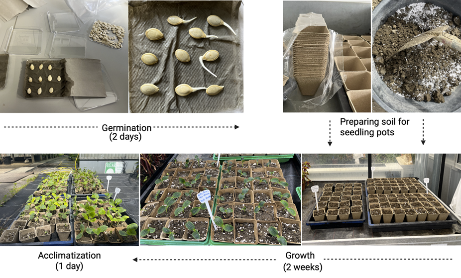 Von beiden Sorten haben wir genügend Samen im Gewächshaus des Instituts keimen lassen und für zwei Wochen in kompostierbaren Töpfen, die sich über Zeit in der Erde auflösen, sowie übrig gebliebener Erde des Botanischen Gartens angezüchtet.
