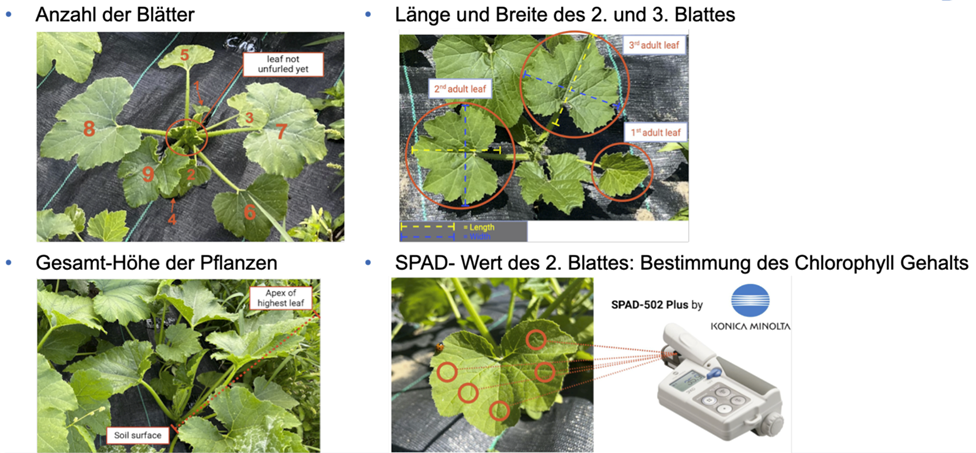 Die Pflanzen beider Zucchini Sorten wurden in drei, um jeweils eine Woche versetzten, „Batches“ angezogen, wobei jedes Batch jeweils alle von den vier Düngerbedingungen enthielt. In jeder Düngerbedingung wurden pro Sorte 14 Pflanzen gepflanzt. Für jedes Batch wurden die Pflanzen über sechs Wochen hinweg wöchentlich vermessen und ausreichend gegossen, bevor die Fruchtbildung im Fokus stand. Die Untersuchung der Blüten und Früchte der Zucchinis erstreckte sich über 8 Wochen.