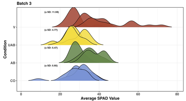 © L. Meyer. Foto der Vinasse-Verteilung (oben links). In RStudio erstellte Grafik (unten) zeigt hohe SD5 bei Vinasse Bedingung, hier gezeigt am Beispiel: SPAD-Messungen für Batch 3 in Costata Romanesco.