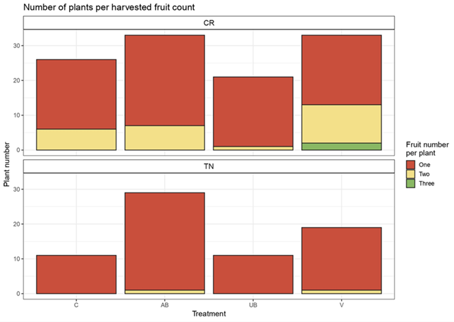 © M. Friebel, Fruchtanzahl für Costata Romaneco und Tondo di Nizza. Die Grafik wurde mit RStudio erstellt.