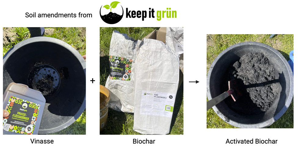 Biokohle kann Wasser und Nährstoffe im Boden speichern und gleichzeitig Kohlenstoff langfristig binden. Sie wirkt in ihrer Funktion etwas wie ein Schwamm: Wenn sie trocken und unbehandelt in der Erde vorliegt, kann sie den Pflanzen erstmal die Nährstoffe entziehen. Deshalb wird Biokohle oft vorher „aktiviert“, zum Beispiel in unserem Experiment mit der Zugabe von flüssiger Vinasse, einem nährstoffreichen Nebenprodukt der Zuckerindustrie.